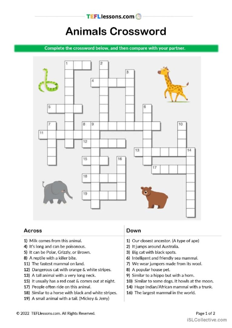 Animals Crossword Crossword English ESL Worksheets Pdf Doc
