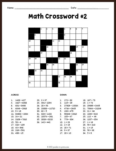 Free Printable Math Crossword Puzzle With Addition And Subtraction